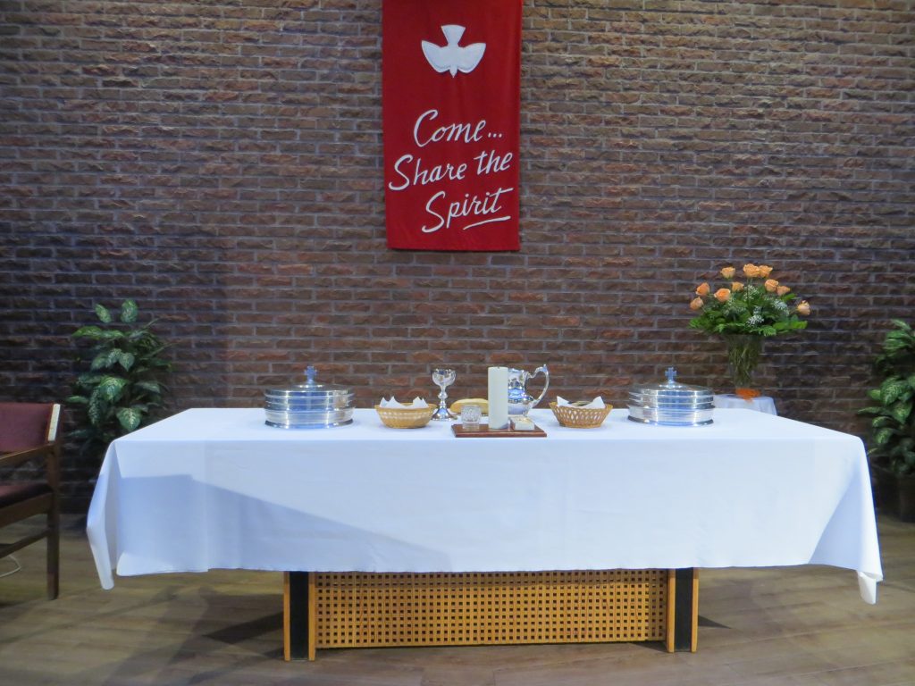 Communion is celebrated at a table that suggests the dining table in our homes. At the communion table, we acknowledge that Jesus Christ is the host and all are guests. The meal uses the symbols of small pieces of bread and a taste of wine or juice to remind us of Jesus’ last supper with his followers and of God’s enduring love.